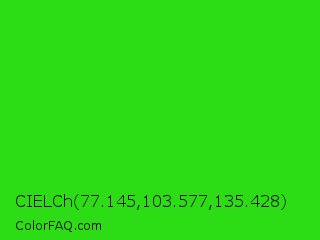 CIELCh 77.145,103.577,135.428 Color is a normal green color and the nearest color is Harlequin Green #46cb18. Hex code #2cdc14 and RGB value is rgb(44,220,20). In RGB color space, this color is composed of 17% red, 86% green, 8% blue, In CMYK color space, this color is composed of 80% cyan, 0% magenta, 91% yellow , 14% black , In HSL color space, this color has a hue angle of 113° , 83% saturation and 47% lightness.