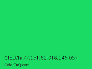 CIELCh 77.151,82.918,146.05 Color is a normal green color and the nearest color is Malachite #0bda51. Hex code #1adb63 and RGB value is rgb(26,219,99). In RGB color space, this color is composed of 10% red, 86% green, 39% blue, In CMYK color space, this color is composed of 88% cyan, 0% magenta, 55% yellow , 14% black , In HSL color space, this color has a hue angle of 143° , 79% saturation and 48% lightness.