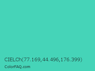 CIELCh 77.169,44.496,176.399 Color is a normal cyan color and the nearest color is Eucalyptus #44d7a8. Hex code #45d4b8 and RGB value is rgb(69,212,184). In RGB color space, this color is composed of 27% red, 83% green, 72% blue, In CMYK color space, this color is composed of 67% cyan, 0% magenta, 13% yellow , 17% black , In HSL color space, this color has a hue angle of 168° , 62% saturation and 55% lightness.