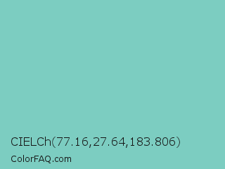 CIELCh 77.16,27.64,183.806 Color is a light cyan color and the nearest color is Monte Carlo #83d0c6. Hex code #7ccdc1 and RGB value is rgb(124,205,193). In RGB color space, this color is composed of 49% red, 80% green, 76% blue, In CMYK color space, this color is composed of 40% cyan, 0% magenta, 6% yellow , 20% black , In HSL color space, this color has a hue angle of 171° , 45% saturation and 65% lightness.