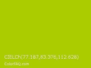 CIELCh 77.187,83.376,112.628 Color is a normal yellow color and the nearest color is Bahia #a5cb0c. Hex code #abcc00 and RGB value is rgb(171,204,0). In RGB color space, this color is composed of 67% red, 80% green, 0% blue, In CMYK color space, this color is composed of 16% cyan, 0% magenta, 100% yellow , 20% black , In HSL color space, this color has a hue angle of 70° , 100% saturation and 40% lightness.