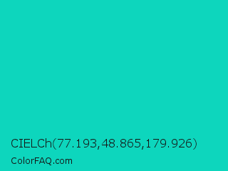 CIELCh 77.193,48.865,179.926 Color is a normal cyan color and the nearest color is Robins Egg Blue #00cccc. Hex code #0dd6bd and RGB value is rgb(13,214,189). In RGB color space, this color is composed of 5% red, 84% green, 74% blue, In CMYK color space, this color is composed of 94% cyan, 0% magenta, 12% yellow , 16% black , In HSL color space, this color has a hue angle of 173° , 89% saturation and 45% lightness.