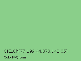 CIELCh 77.199,44.878,142.05 Color is a light green color and the nearest color is De York #7ac488. Hex code #8acf8a and RGB value is rgb(138,207,138). In RGB color space, this color is composed of 54% red, 81% green, 54% blue, In CMYK color space, this color is composed of 33% cyan, 0% magenta, 33% yellow , 19% black , In HSL color space, this color has a hue angle of 120° , 42% saturation and 68% lightness.