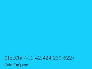 CIELCh 77.1,42.424,230.622 Color is a normal cyan color and the nearest color is Spiro Disco Ball #0fc0fc. Hex code #16cffa and RGB value is rgb(22,207,250). In RGB color space, this color is composed of 9% red, 81% green, 98% blue, In CMYK color space, this color is composed of 91% cyan, 17% magenta, 0% yellow , 2% black , In HSL color space, this color has a hue angle of 191° , 96% saturation and 53% lightness.