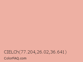 CIELCh 77.204,26.02,36.641 Color is a light red color and the nearest color is Rose Bud #fbb2a3. Hex code #eeb0a3 and RGB value is rgb(238,176,163). In RGB color space, this color is composed of 93% red, 69% green, 64% blue, In CMYK color space, this color is composed of 0% cyan, 26% magenta, 32% yellow , 7% black , In HSL color space, this color has a hue angle of 10° , 69% saturation and 79% lightness.