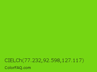 CIELCh 77.232,92.598,127.117 Color is a normal green color and the nearest color is Alien Armpit #84de02. Hex code #75d612 and RGB value is rgb(117,214,18). In RGB color space, this color is composed of 46% red, 84% green, 7% blue, In CMYK color space, this color is composed of 45% cyan, 0% magenta, 92% yellow , 16% black , In HSL color space, this color has a hue angle of 90° , 84% saturation and 45% lightness.