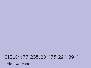 CIELCh 77.235,20.475,294.894 Color is a very light indigo color and the nearest color is Blue Haze #bfbed8. Hex code #bebbe1 and RGB value is rgb(190,187,225). In RGB color space, this color is composed of 75% red, 73% green, 88% blue, In CMYK color space, this color is composed of 16% cyan, 17% magenta, 0% yellow , 12% black , In HSL color space, this color has a hue angle of 245° , 39% saturation and 81% lightness.