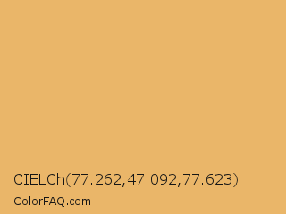 CIELCh 77.262,47.092,77.623 Color is a light orange color and the nearest color is Porsche #eaae69. Hex code #eab669 and RGB value is rgb(234,182,105). In RGB color space, this color is composed of 92% red, 71% green, 41% blue, In CMYK color space, this color is composed of 0% cyan, 22% magenta, 55% yellow , 8% black , In HSL color space, this color has a hue angle of 36° , 75% saturation and 66% lightness.