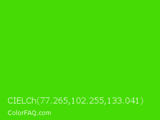 CIELCh 77.265,102.255,133.041 Color is a normal green color and the nearest color is Harlequin Green #46cb18. Hex code #46db04 and RGB value is rgb(70,219,4). In RGB color space, this color is composed of 27% red, 86% green, 2% blue, In CMYK color space, this color is composed of 68% cyan, 0% magenta, 98% yellow , 14% black , In HSL color space, this color has a hue angle of 102° , 96% saturation and 44% lightness.