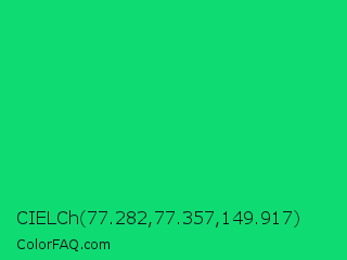CIELCh 77.282,77.357,149.917 Color is a normal green color and the nearest color is Malachite #0bda51. Hex code #0fdb73 and RGB value is rgb(15,219,115). In RGB color space, this color is composed of 6% red, 86% green, 45% blue, In CMYK color space, this color is composed of 93% cyan, 0% magenta, 47% yellow , 14% black , In HSL color space, this color has a hue angle of 149° , 87% saturation and 46% lightness.