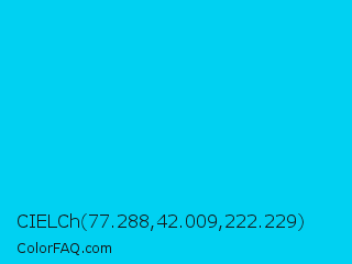 CIELCh 77.288,42.009,222.229 Color is a normal cyan color and the nearest color is Vivid Sky Blue #00ccff. Hex code #00d1f2 and RGB value is rgb(0,209,242). In RGB color space, this color is composed of 0% red, 82% green, 95% blue, In CMYK color space, this color is composed of 100% cyan, 14% magenta, 0% yellow , 5% black , In HSL color space, this color has a hue angle of 188° , 100% saturation and 47% lightness.