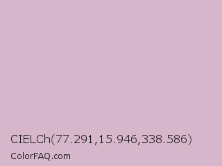CIELCh 77.291,15.946,338.586 Color is a light magenta color and the nearest color is Pink Lavender #d8b2d1. Hex code #d6b6ca and RGB value is rgb(214,182,202). In RGB color space, this color is composed of 84% red, 71% green, 79% blue, In CMYK color space, this color is composed of 0% cyan, 15% magenta, 6% yellow , 16% black , In HSL color space, this color has a hue angle of 323° , 28% saturation and 78% lightness.