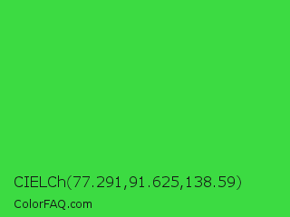 CIELCh 77.291,91.625,138.59 Color is a normal green color and the nearest color is Lime Green #32cd32. Hex code #3cdb42 and RGB value is rgb(60,219,66). In RGB color space, this color is composed of 24% red, 86% green, 26% blue, In CMYK color space, this color is composed of 73% cyan, 0% magenta, 70% yellow , 14% black , In HSL color space, this color has a hue angle of 122° , 69% saturation and 55% lightness.