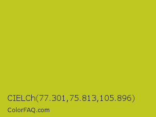 CIELCh 77.301,75.813,105.896 Color is a normal yellow color and the nearest color is Key Lime Pie #bfc921. Hex code #bfc721 and RGB value is rgb(191,199,33). In RGB color space, this color is composed of 75% red, 78% green, 13% blue, In CMYK color space, this color is composed of 4% cyan, 0% magenta, 83% yellow , 22% black , In HSL color space, this color has a hue angle of 63° , 72% saturation and 45% lightness.