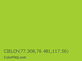 CIELCh 77.308,76.481,117.56 Color is a normal lime color and the nearest color is Yellow Green #9acd32. Hex code #a2ce31 and RGB value is rgb(162,206,49). In RGB color space, this color is composed of 64% red, 81% green, 19% blue, In CMYK color space, this color is composed of 21% cyan, 0% magenta, 76% yellow , 19% black , In HSL color space, this color has a hue angle of 77° , 62% saturation and 50% lightness.