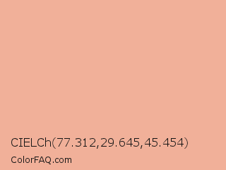 CIELCh 77.312,29.645,45.454 Color is a light orange color and the nearest color is Rose Bud #fbb2a3. Hex code #f1b099 and RGB value is rgb(241,176,153). In RGB color space, this color is composed of 95% red, 69% green, 60% blue, In CMYK color space, this color is composed of 0% cyan, 27% magenta, 37% yellow , 5% black , In HSL color space, this color has a hue angle of 16° , 76% saturation and 77% lightness.