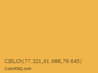 CIELCh 77.321,61.688,79.645 Color is a light orange color and the nearest color is Maximum Yellow Red #f2ba49. Hex code #f0b54a and RGB value is rgb(240,181,74). In RGB color space, this color is composed of 94% red, 71% green, 29% blue, In CMYK color space, this color is composed of 0% cyan, 25% magenta, 69% yellow , 6% black , In HSL color space, this color has a hue angle of 39° , 85% saturation and 62% lightness.