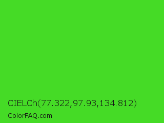 CIELCh 77.322,97.93,134.812 Color is a normal green color and the nearest color is Harlequin Green #46cb18. Hex code #45db26 and RGB value is rgb(69,219,38). In RGB color space, this color is composed of 27% red, 86% green, 15% blue, In CMYK color space, this color is composed of 68% cyan, 0% magenta, 83% yellow , 14% black , In HSL color space, this color has a hue angle of 110° , 72% saturation and 50% lightness.
