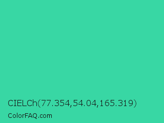 CIELCh 77.354,54.04,165.319 Color is a normal green color and the nearest color is Eucalyptus #44d7a8. Hex code #38d7a4 and RGB value is rgb(56,215,164). In RGB color space, this color is composed of 22% red, 84% green, 64% blue, In CMYK color space, this color is composed of 74% cyan, 0% magenta, 24% yellow , 16% black , In HSL color space, this color has a hue angle of 161° , 67% saturation and 53% lightness.