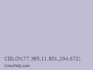CIELCh 77.385,11.851,294.672 Color is a light indigo color and the nearest color is Lavender Gray #bdbbd7. Hex code #bfbdd3 and RGB value is rgb(191,189,211). In RGB color space, this color is composed of 75% red, 74% green, 83% blue, In CMYK color space, this color is composed of 9% cyan, 10% magenta, 0% yellow , 17% black , In HSL color space, this color has a hue angle of 245° , 20% saturation and 78% lightness.