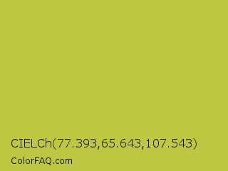 CIELCh 77.393,65.643,107.543 Color is a normal yellow color and the nearest color is Turmeric #cabb48. Hex code #bec742 and RGB value is rgb(190,199,66). In RGB color space, this color is composed of 75% red, 78% green, 26% blue, In CMYK color space, this color is composed of 5% cyan, 0% magenta, 67% yellow , 22% black , In HSL color space, this color has a hue angle of 64° , 54% saturation and 52% lightness.