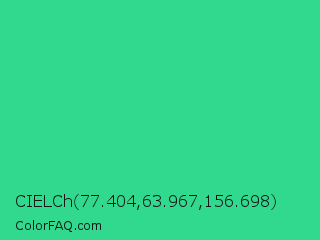 CIELCh 77.404,63.967,156.698 Color is a normal green color and the nearest color is Shamrock #33cc99. Hex code #30d98e and RGB value is rgb(48,217,142). In RGB color space, this color is composed of 19% red, 85% green, 56% blue, In CMYK color space, this color is composed of 78% cyan, 0% magenta, 35% yellow , 15% black , In HSL color space, this color has a hue angle of 153° , 69% saturation and 52% lightness.