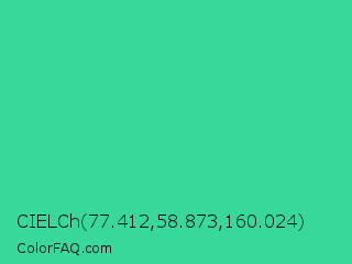 CIELCh 77.412,58.873,160.024 Color is a normal green color and the nearest color is Shamrock #33cc99. Hex code #38d898 and RGB value is rgb(56,216,152). In RGB color space, this color is composed of 22% red, 85% green, 60% blue, In CMYK color space, this color is composed of 74% cyan, 0% magenta, 30% yellow , 15% black , In HSL color space, this color has a hue angle of 156° , 67% saturation and 53% lightness.