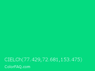 CIELCh 77.429,72.681,153.475 Color is a normal green color and the nearest color is Caribbean Green #00cc99. Hex code #04db80 and RGB value is rgb(4,219,128). In RGB color space, this color is composed of 2% red, 86% green, 50% blue, In CMYK color space, this color is composed of 98% cyan, 0% magenta, 42% yellow , 14% black , In HSL color space, this color has a hue angle of 155° , 96% saturation and 44% lightness.