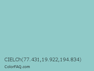 CIELCh 77.431,19.922,194.834 Color is a light cyan color and the nearest color is Half Baked #85c4cc. Hex code #8fcac8 and RGB value is rgb(143,202,200). In RGB color space, this color is composed of 56% red, 79% green, 78% blue, In CMYK color space, this color is composed of 29% cyan, 0% magenta, 1% yellow , 21% black , In HSL color space, this color has a hue angle of 178° , 36% saturation and 68% lightness.