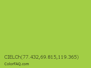 CIELCh 77.432,69.815,119.365 Color is a normal lime color and the nearest color is Android Green #a4c639. Hex code #a2ce45 and RGB value is rgb(162,206,69). In RGB color space, this color is composed of 64% red, 81% green, 27% blue, In CMYK color space, this color is composed of 21% cyan, 0% magenta, 67% yellow , 19% black , In HSL color space, this color has a hue angle of 79° , 58% saturation and 54% lightness.