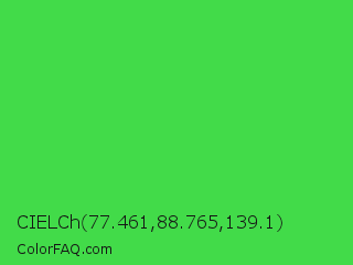 CIELCh 77.461,88.765,139.1 Color is a normal green color and the nearest color is Lime Green #32cd32. Hex code #42db49 and RGB value is rgb(66,219,73). In RGB color space, this color is composed of 26% red, 86% green, 29% blue, In CMYK color space, this color is composed of 70% cyan, 0% magenta, 67% yellow , 14% black , In HSL color space, this color has a hue angle of 123° , 68% saturation and 56% lightness.