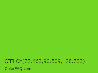 CIELCh 77.463,90.509,128.733 Color is a normal green color and the nearest color is Lima #76bd17. Hex code #72d724 and RGB value is rgb(114,215,36). In RGB color space, this color is composed of 45% red, 84% green, 14% blue, In CMYK color space, this color is composed of 47% cyan, 0% magenta, 83% yellow , 16% black , In HSL color space, this color has a hue angle of 94° , 71% saturation and 49% lightness.