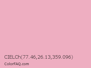 CIELCh 77.46,26.13,359.096 Color is a very light rose color and the nearest color is Nadeshiko Pink #f6adc6. Hex code #eeaec1 and RGB value is rgb(238,174,193). In RGB color space, this color is composed of 93% red, 68% green, 76% blue, In CMYK color space, this color is composed of 0% cyan, 27% magenta, 19% yellow , 7% black , In HSL color space, this color has a hue angle of 342° , 65% saturation and 81% lightness.