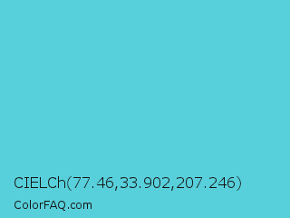 CIELCh 77.46,33.902,207.246 Color is a normal cyan color and the nearest color is Viking #64ccdb. Hex code #58d0db and RGB value is rgb(88,208,219). In RGB color space, this color is composed of 35% red, 82% green, 86% blue, In CMYK color space, this color is composed of 60% cyan, 5% magenta, 0% yellow , 14% black , In HSL color space, this color has a hue angle of 185° , 65% saturation and 60% lightness.