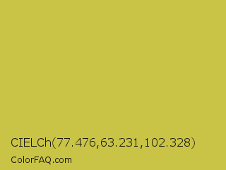 CIELCh 77.476,63.231,102.328 Color is a normal yellow color and the nearest color is Turmeric #cabb48. Hex code #c9c445 and RGB value is rgb(201,196,69). In RGB color space, this color is composed of 79% red, 77% green, 27% blue, In CMYK color space, this color is composed of 0% cyan, 2% magenta, 66% yellow , 21% black , In HSL color space, this color has a hue angle of 58° , 55% saturation and 53% lightness.