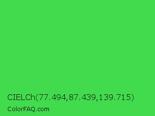 CIELCh 77.494,87.439,139.715 Color is a normal green color and the nearest color is Lime Green #32cd32. Hex code #42db4d and RGB value is rgb(66,219,77). In RGB color space, this color is composed of 26% red, 86% green, 30% blue, In CMYK color space, this color is composed of 70% cyan, 0% magenta, 65% yellow , 14% black , In HSL color space, this color has a hue angle of 124° , 68% saturation and 56% lightness.