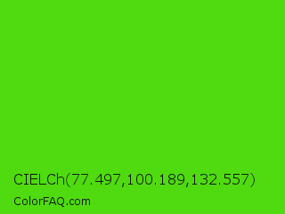 CIELCh 77.497,100.189,132.557 Color is a normal green color and the nearest color is Harlequin Green #46cb18. Hex code #4fdb10 and RGB value is rgb(79,219,16). In RGB color space, this color is composed of 31% red, 86% green, 6% blue, In CMYK color space, this color is composed of 64% cyan, 0% magenta, 93% yellow , 14% black , In HSL color space, this color has a hue angle of 101° , 86% saturation and 46% lightness.
