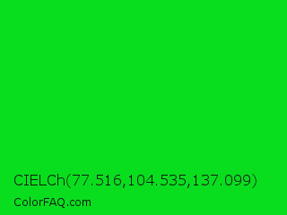 CIELCh 77.516,104.535,137.099 Color is a normal green color and the nearest color is Vivid Malachite #00cc33. Hex code #09de1e and RGB value is rgb(9,222,30). In RGB color space, this color is composed of 4% red, 87% green, 12% blue, In CMYK color space, this color is composed of 96% cyan, 0% magenta, 86% yellow , 13% black , In HSL color space, this color has a hue angle of 126° , 92% saturation and 45% lightness.