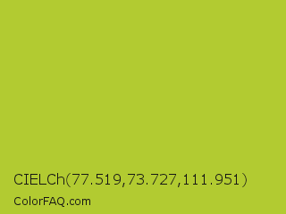 CIELCh 77.519,73.727,111.951 Color is a normal yellow color and the nearest color is Android Green #a4c639. Hex code #b2cb31 and RGB value is rgb(178,203,49). In RGB color space, this color is composed of 70% red, 80% green, 19% blue, In CMYK color space, this color is composed of 12% cyan, 0% magenta, 76% yellow , 20% black , In HSL color space, this color has a hue angle of 70° , 61% saturation and 49% lightness.