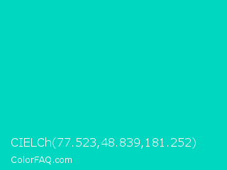 CIELCh 77.523,48.839,181.252 Color is a normal cyan color and the nearest color is Robins Egg Blue #00cccc. Hex code #00d7c0 and RGB value is rgb(0,215,192). In RGB color space, this color is composed of 0% red, 84% green, 75% blue, In CMYK color space, this color is composed of 100% cyan, 0% magenta, 11% yellow , 16% black , In HSL color space, this color has a hue angle of 174° , 100% saturation and 42% lightness.
