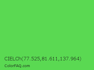 CIELCh 77.525,81.611,137.964 Color is a normal green color and the nearest color is Mantis #74c365. Hex code #5ad952 and RGB value is rgb(90,217,82). In RGB color space, this color is composed of 35% red, 85% green, 32% blue, In CMYK color space, this color is composed of 59% cyan, 0% magenta, 62% yellow , 15% black , In HSL color space, this color has a hue angle of 116° , 64% saturation and 59% lightness.