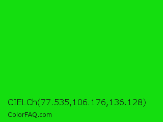 CIELCh 77.535,106.176,136.128 Color is a normal green color and the nearest color is Green #00ff00. Hex code #14de0f and RGB value is rgb(20,222,15). In RGB color space, this color is composed of 8% red, 87% green, 6% blue, In CMYK color space, this color is composed of 91% cyan, 0% magenta, 93% yellow , 13% black , In HSL color space, this color has a hue angle of 119° , 87% saturation and 46% lightness.