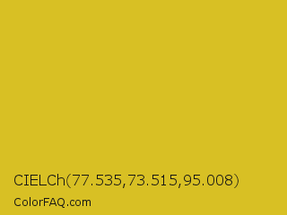 CIELCh 77.535,73.515,95.008 Color is a normal yellow color and the nearest color is Gold Tips #deba13. Hex code #d8c024 and RGB value is rgb(216,192,36). In RGB color space, this color is composed of 85% red, 75% green, 14% blue, In CMYK color space, this color is composed of 0% cyan, 11% magenta, 83% yellow , 15% black , In HSL color space, this color has a hue angle of 52° , 71% saturation and 49% lightness.