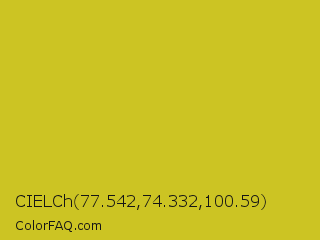 CIELCh 77.542,74.332,100.59 Color is a normal yellow color and the nearest color is Key Lime Pie #bfc921. Hex code #ccc423 and RGB value is rgb(204,196,35). In RGB color space, this color is composed of 80% red, 77% green, 14% blue, In CMYK color space, this color is composed of 0% cyan, 4% magenta, 83% yellow , 20% black , In HSL color space, this color has a hue angle of 57° , 71% saturation and 47% lightness.