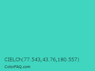 CIELCh 77.543,43.76,180.557 Color is a normal cyan color and the nearest color is Medium Turquoise #48d1cc. Hex code #40d5bf and RGB value is rgb(64,213,191). In RGB color space, this color is composed of 25% red, 84% green, 75% blue, In CMYK color space, this color is composed of 70% cyan, 0% magenta, 10% yellow , 16% black , In HSL color space, this color has a hue angle of 171° , 64% saturation and 54% lightness.