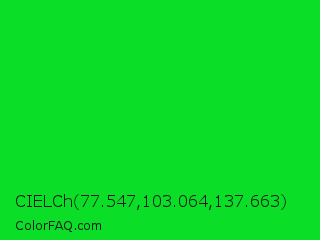CIELCh 77.547,103.064,137.663 Color is a normal green color and the nearest color is Vivid Malachite #00cc33. Hex code #0ade26 and RGB value is rgb(10,222,38). In RGB color space, this color is composed of 4% red, 87% green, 15% blue, In CMYK color space, this color is composed of 95% cyan, 0% magenta, 83% yellow , 13% black , In HSL color space, this color has a hue angle of 128° , 91% saturation and 45% lightness.