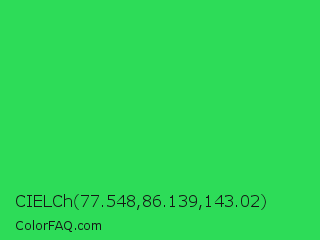 CIELCh 77.548,86.139,143.02 Color is a normal green color and the nearest color is UFO Green #3cd070. Hex code #2ddc58 and RGB value is rgb(45,220,88). In RGB color space, this color is composed of 18% red, 86% green, 35% blue, In CMYK color space, this color is composed of 80% cyan, 0% magenta, 60% yellow , 14% black , In HSL color space, this color has a hue angle of 135° , 71% saturation and 52% lightness.