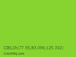 CIELCh 77.55,83.099,125.332 Color is a normal green color and the nearest color is Atlantis #97cd2d. Hex code #87d430 and RGB value is rgb(135,212,48). In RGB color space, this color is composed of 53% red, 83% green, 19% blue, In CMYK color space, this color is composed of 36% cyan, 0% magenta, 77% yellow , 17% black , In HSL color space, this color has a hue angle of 88° , 66% saturation and 51% lightness.