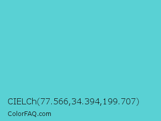 CIELCh 77.566,34.394,199.707 Color is a normal cyan color and the nearest color is Viking #64ccdb. Hex code #59d1d4 and RGB value is rgb(89,209,212). In RGB color space, this color is composed of 35% red, 82% green, 83% blue, In CMYK color space, this color is composed of 58% cyan, 1% magenta, 0% yellow , 17% black , In HSL color space, this color has a hue angle of 181° , 59% saturation and 59% lightness.