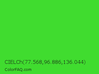 CIELCh 77.568,96.886,136.044 Color is a normal green color and the nearest color is Lime Green #32cd32. Hex code #40dc2f and RGB value is rgb(64,220,47). In RGB color space, this color is composed of 25% red, 86% green, 18% blue, In CMYK color space, this color is composed of 71% cyan, 0% magenta, 79% yellow , 14% black , In HSL color space, this color has a hue angle of 114° , 71% saturation and 52% lightness.